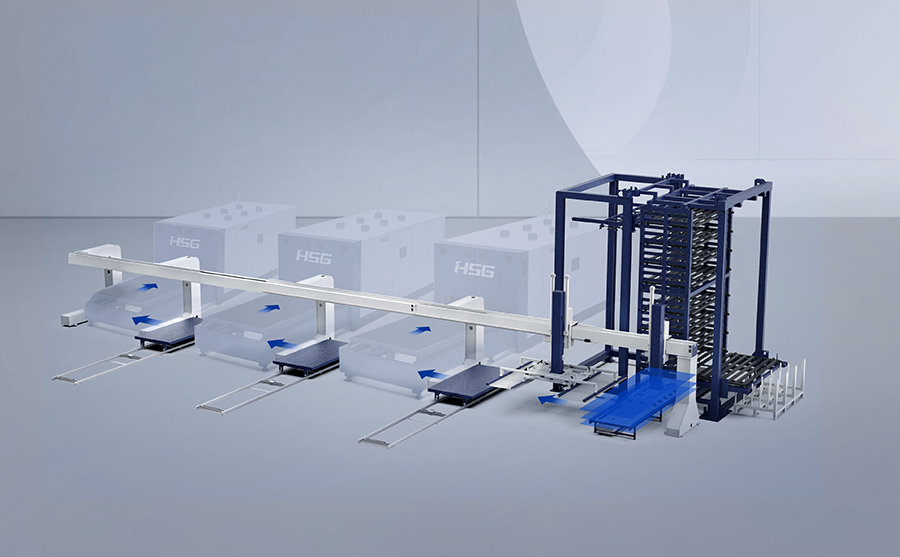 以Alpha T總線系統+X Factory中控系統,打通主機與料庫之間的信息交互,宏山激光FMS激光切割柔性制造系統,將多臺并行的工作系統為基準,持續輸送,連續切割。